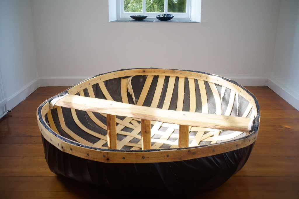 inspired by a coracle I made recently in Coed Llwyn Onn workshop. Coracles on the River Dwyryd were a more rectangular shape – I chose this classic traditional design as I could see links with my own work.