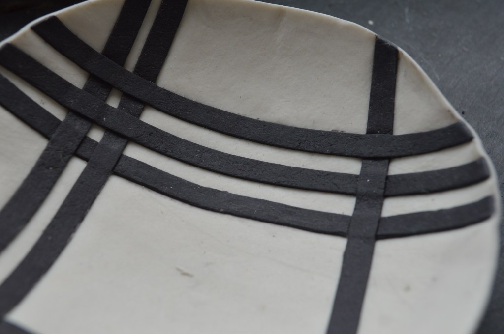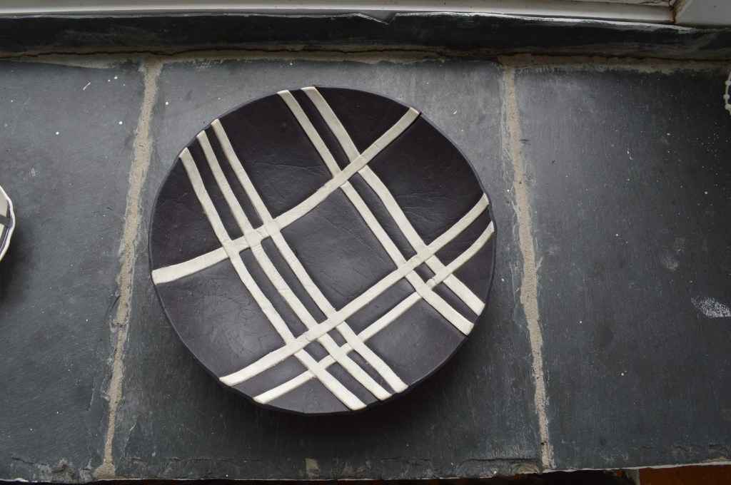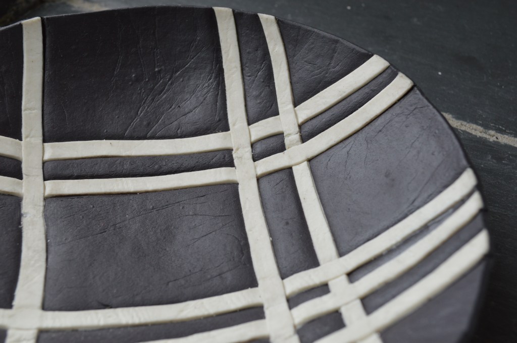 The black and white porcelain vessels make a connection with the coracle: the black body with the bitumen outer shell and the inner woven ash lathes picked out with strips of white clay.