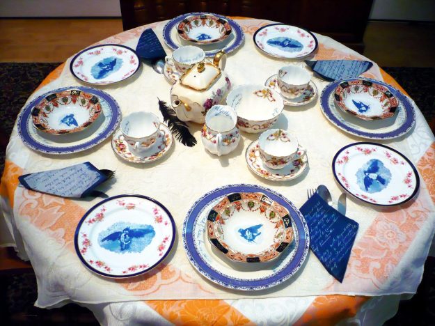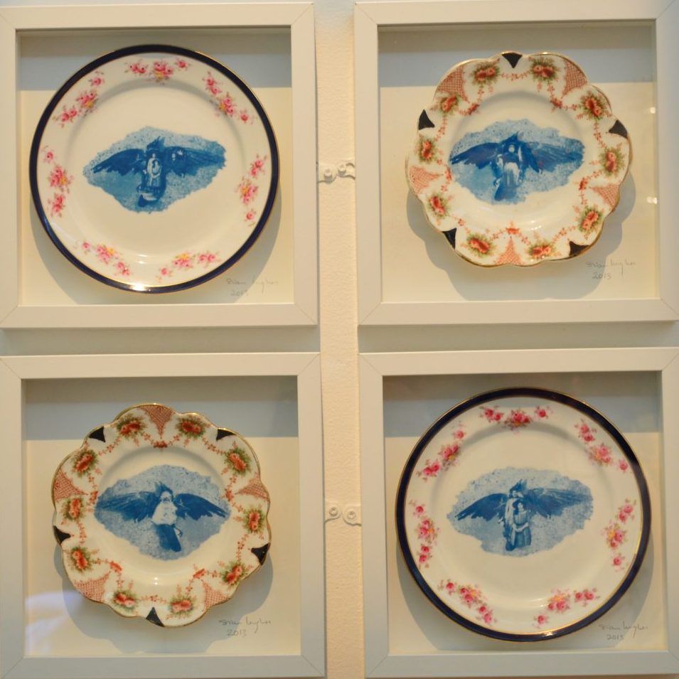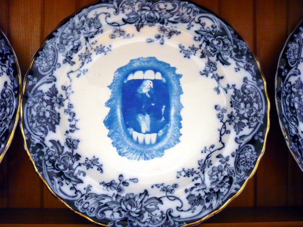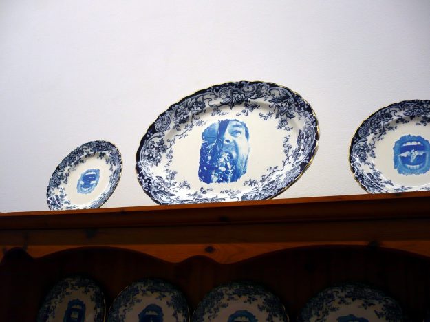 At a distance Sian Hughes’ Dresser Plates & Bowls, 2013 appear tranquil in their blue & white correctness, but look closer and each one holds in its centre an open mouth – a silent screaming orifice regurgitating faded images of Victorian figures, seagulls and windows