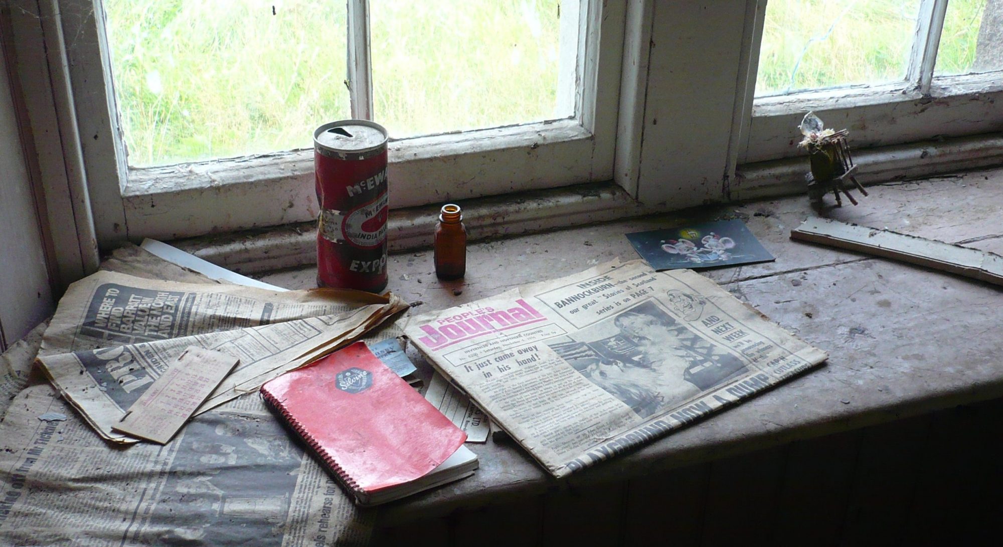 Walking in Scotland in 2012 with friends, and came across an abandoned tenant farmer’s house. The sheep had taken over and trees grew from the chimney. Some furniture remained,