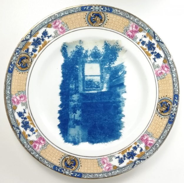 Working with cyanotype in my studio, I layered text and image onto tea plates, celebrating with ordinary domesticity the re-viewing of what remained.