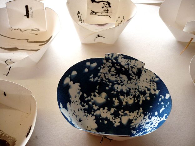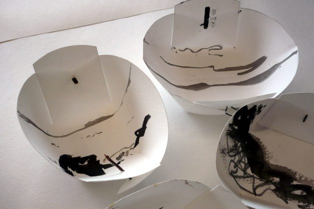 These originated with the exploration of paper forms using elements of origami and slit and cut techniques fixing with toothpicks, reeds, stitch and thread. The emerging vessels echoed a range of shapes from sake cups and bowls to coracles.