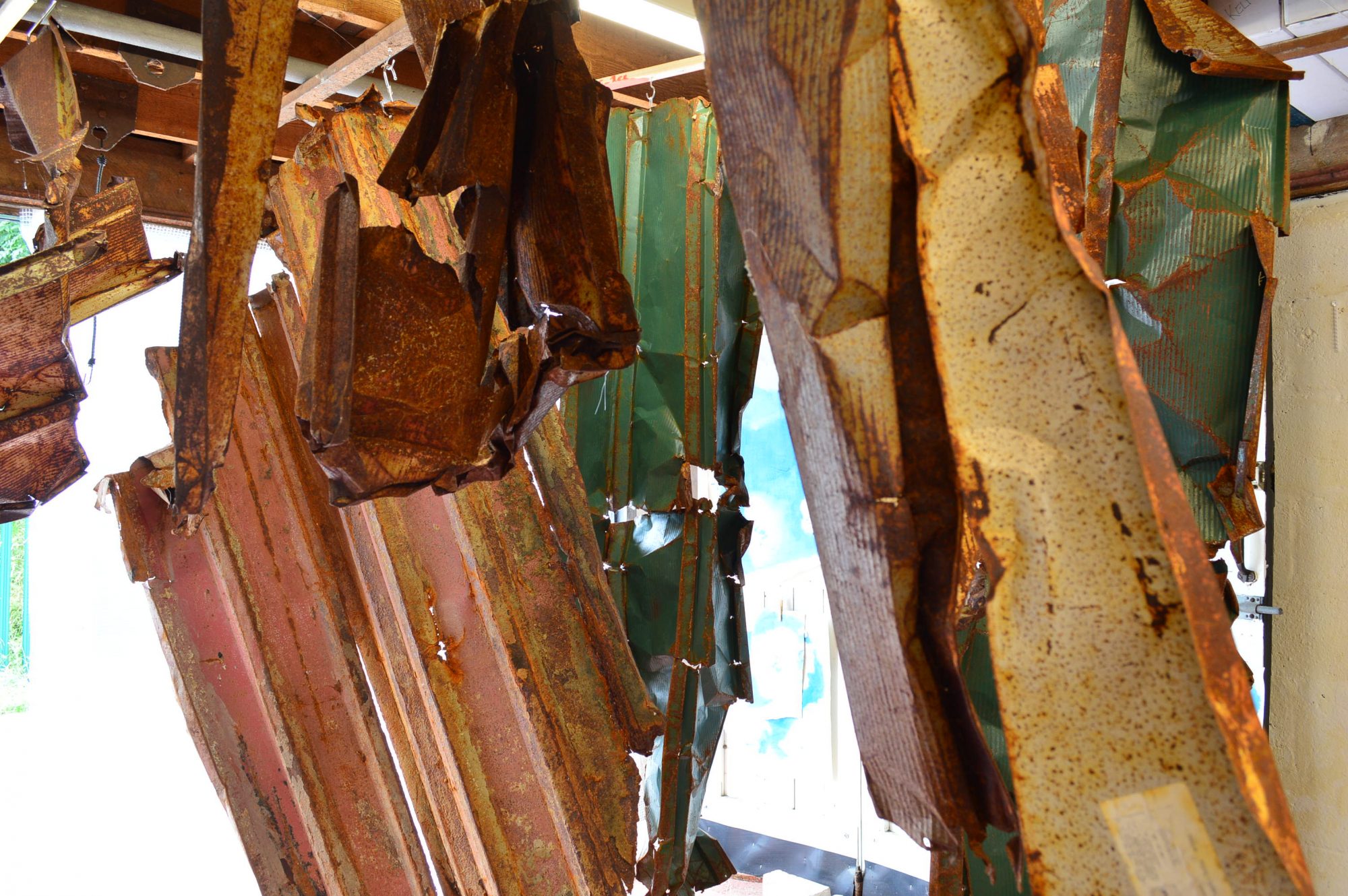 Over the course of 6 weeks, several rusted corrugated shed sidings washed ashore. I started to collect them, carrying them back to hang in my studio.