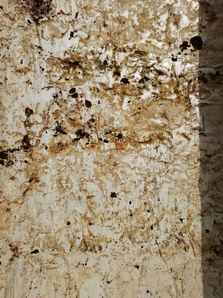 The work references geological strata, strips of wallpaper, and the gentle light coming from inside [behind] almost makes you think of skin. The wall that she cast was quite a chunky exposed wall – we had done a lot of hacking off of the wet plaster when we first got the house – so there are some very rough, very sandy, I suppose you could say, dirty walls.