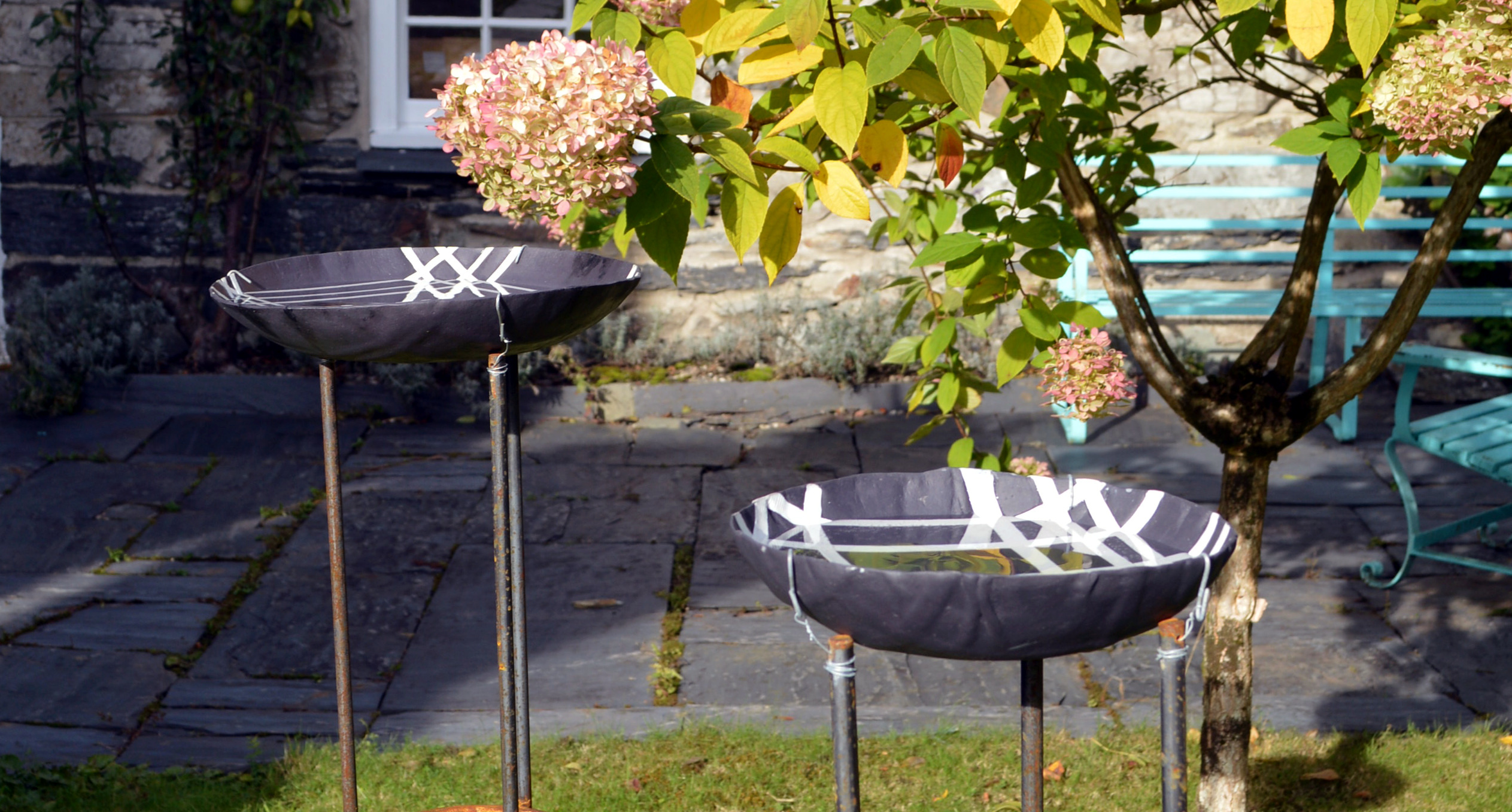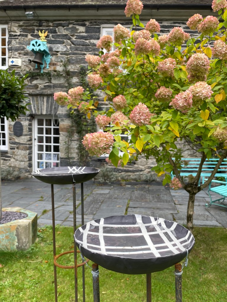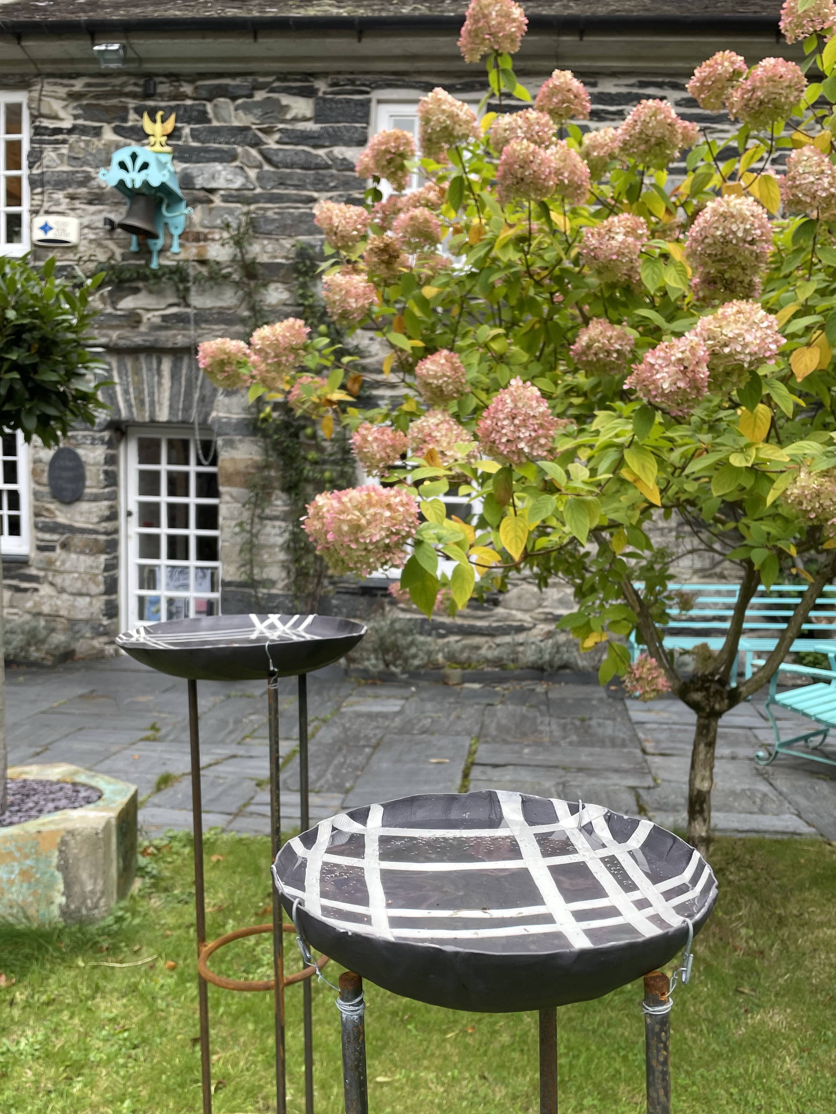 Outdoor sculptures Black and white porcelain vessels in the grounds of Plas Brondanw on delicate metal structures. They can be seen from the buttress coracle room making connections with the metal framework around the central tree seating. Share this: Click to print (Opens in new window) Print Like Loading...
