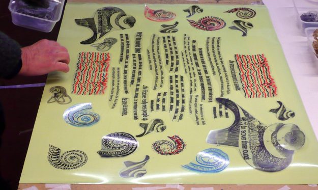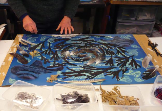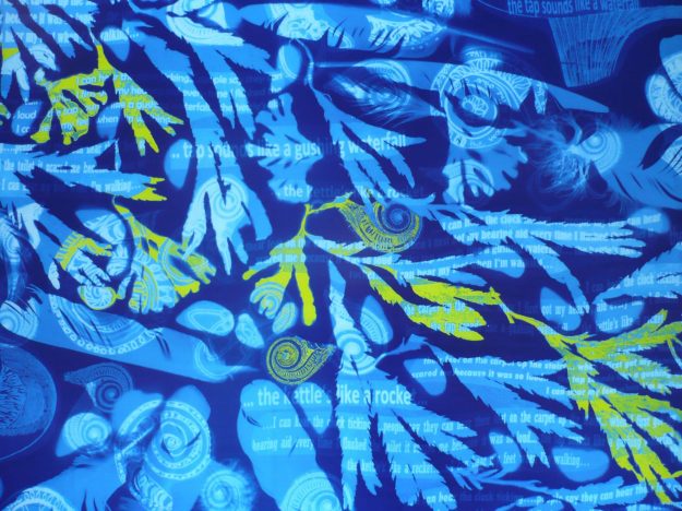 I used the same design elements in each: seaweed, feathers and shells. Each has their own text taken from my interactions with staff and out patients and reflect experiences of living with hearing loss – and hearing aids. These layers allow people to return to the work consider them in more depth and find new detail.