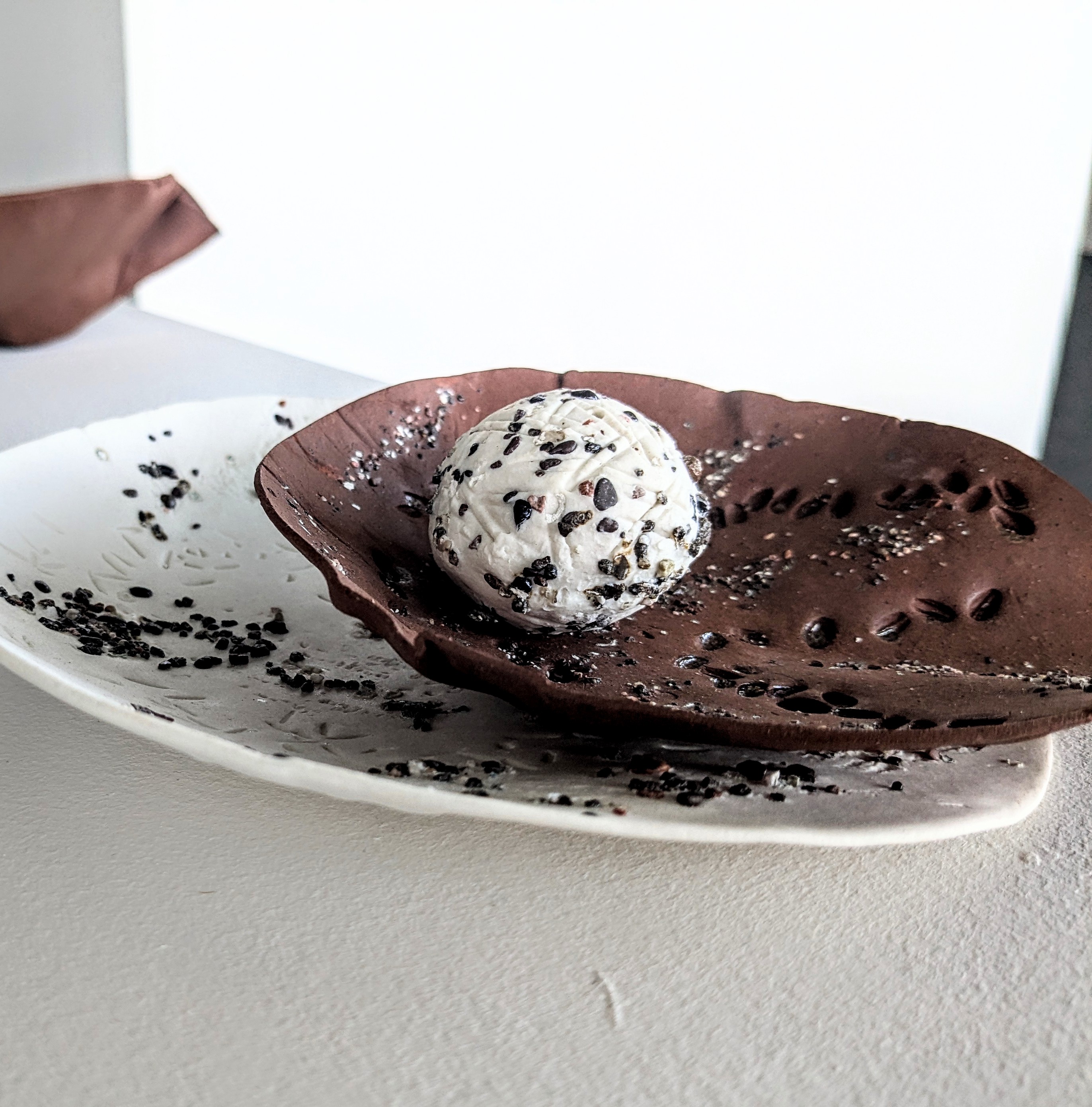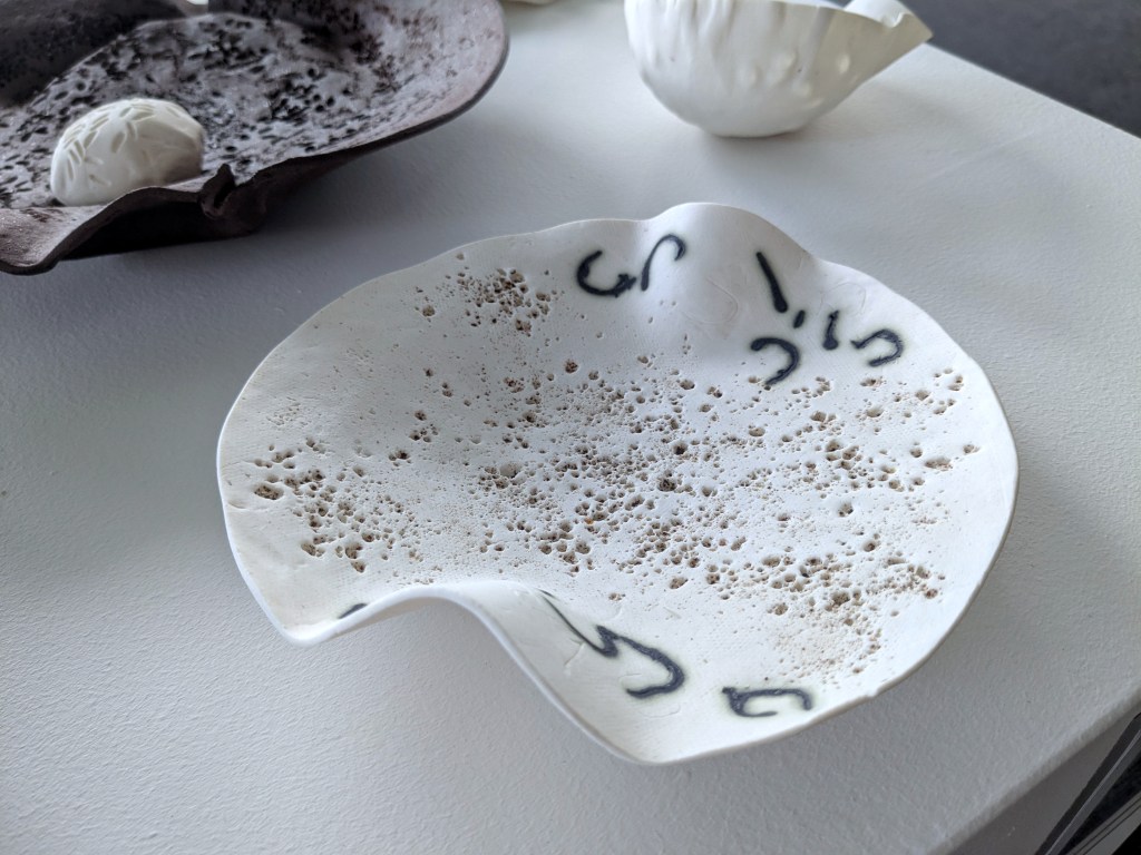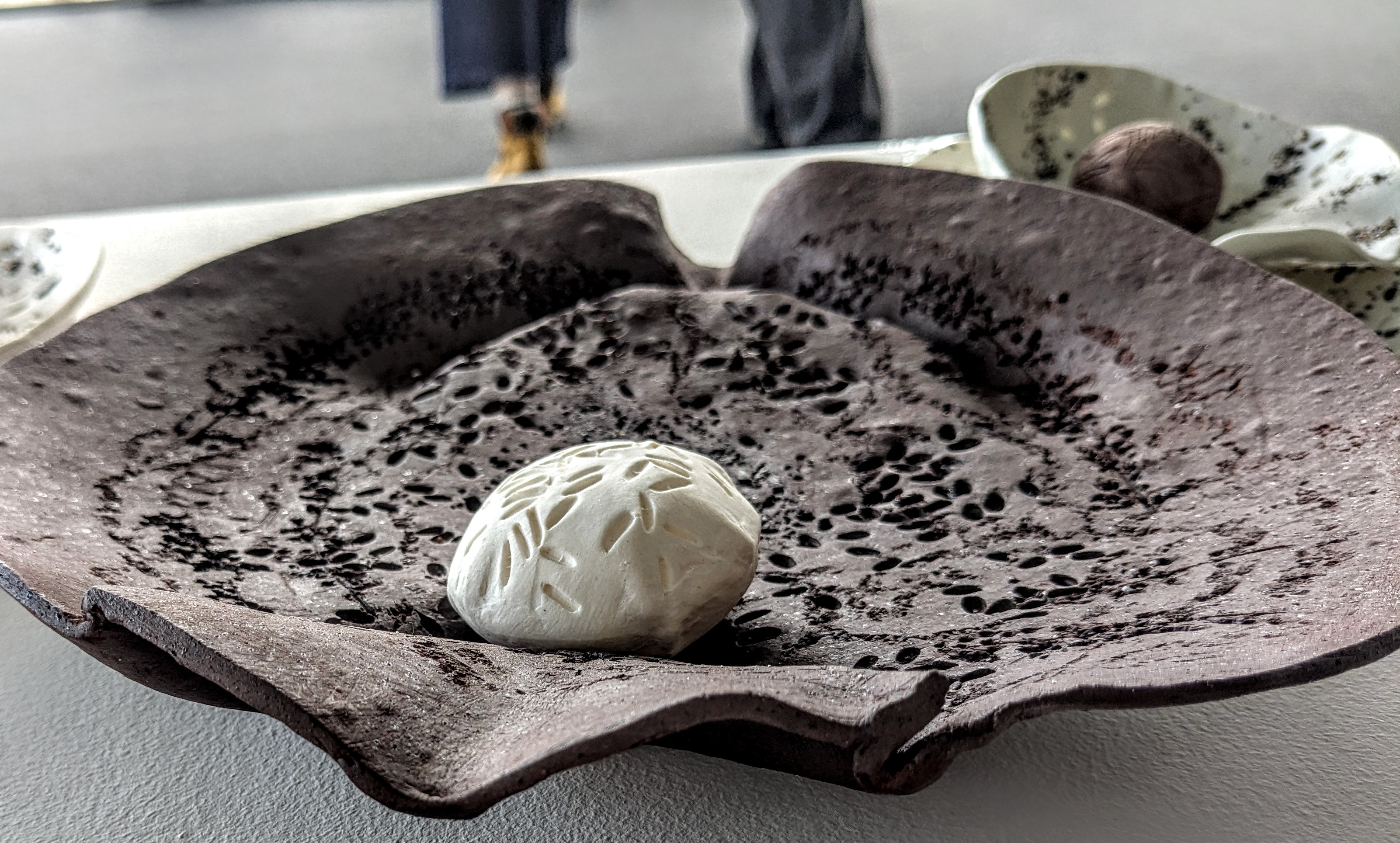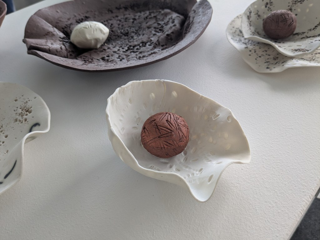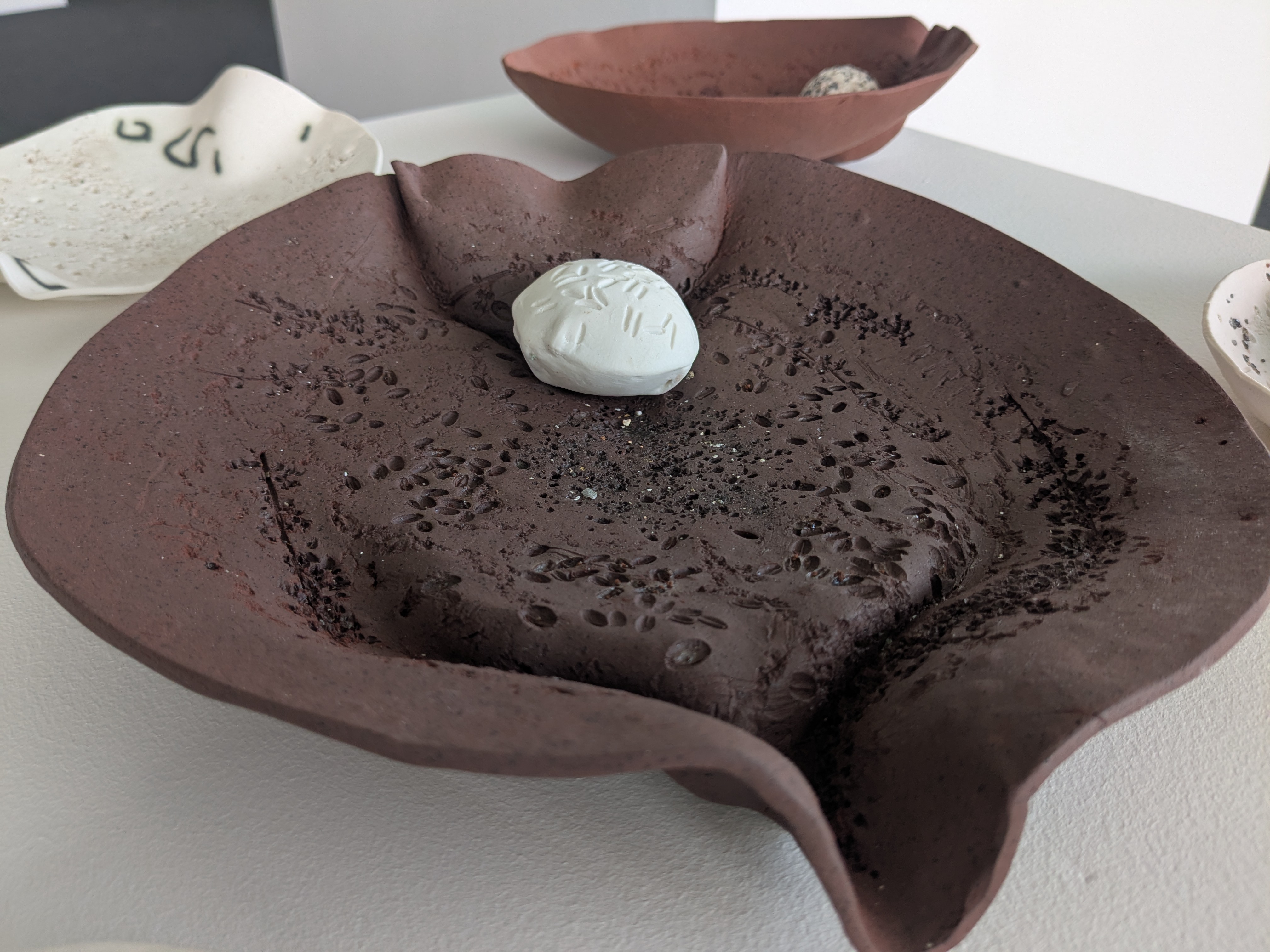 I worked with both porcelain and terra cotta, pressing in a variety of materials to reflect the grinding surfaces of both the mortars and the pestles – from shale to impressed grains.